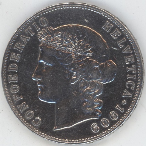 Suisse / Schweiz 5 Francs 1909 (ss) coup sur la tranche en argent 0.900 (25gr)