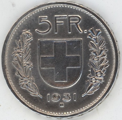 5 Francs 1931 Abart 10* sur la tête (ss+) en argent 0.835 (15gr)