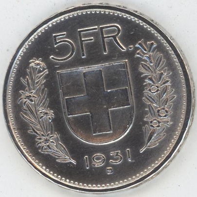Suisse / Schweiz 5 Francs 1931 Abart Décalée de 70° (vz) en argent 0.835 (15gr)