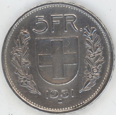 Suisse / Schweiz 5 Francs 1931 (ss) en argent 0.835 (15gr)