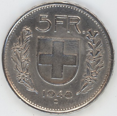 Suisse / Schweiz 5 Francs 1948 (ss) en argent 0.835 (15gr)
