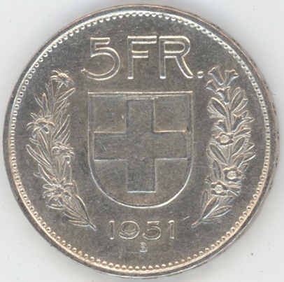 Suisse / Schweiz 5 Francs 1951 (ss) en argent 0.835 (15gr)