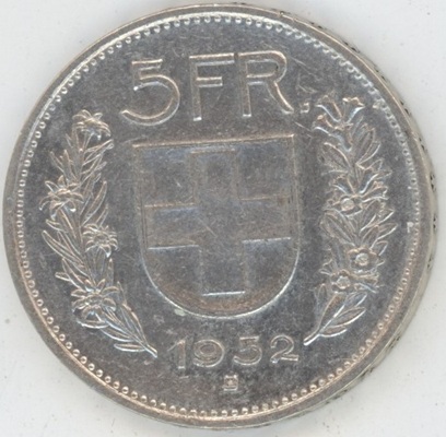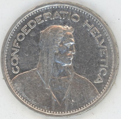 Suisse / Schweiz 5 Francs 1952 (ss) petit coup sur la tranche en argent 0.835 (15gr)