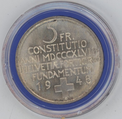 Suisse / Schweiz 5 Francs comm. 1948 Verfassung (vz-unz) en argent 0.835 (15gr)