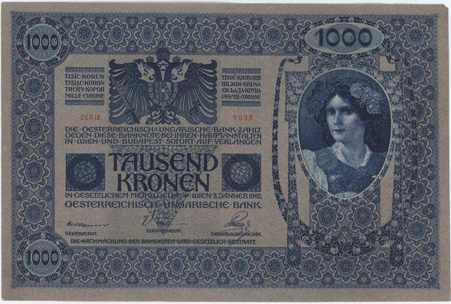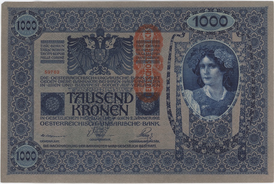 Autriche Banque Austro-Hongroise 1000 Kronen 1902 ND (1919) avec surcharge rouge « Deustschosterreich » presque neuf Information le numéro de série peut changer de celui de l’image