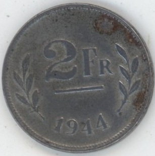 Belgique 2 Francs 1944 Léopold III (ss) Acier recouvert de zinc KM# 133