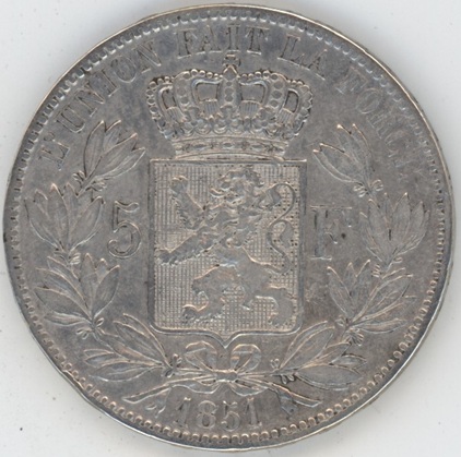 Belgique 5 Francs 1851 Leopold I (ss) en argent 0.900 (25gr) KM# 17