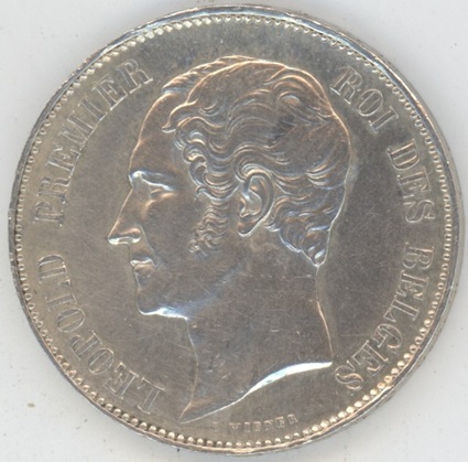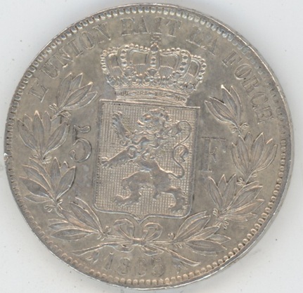 Belgique 5 Francs 1865 Leopold I (vz) en argent 0.900 (25gr) KM# 17