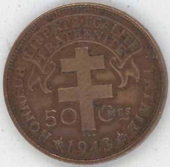 Cameroun France Libre 50 Centimes 1943 SA (ss-vz) Bronze KM# 6