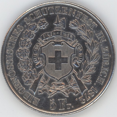Ecus de Tir 5 Francs 1872 Zürich (ss+) en argent 0.900 (25gr)