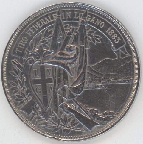 Suisse / Schweiz Ecus de Tir 5 Francs 1883 Lugano (ss+) petit coup sur la tranche en argent 0.900 (25gr)