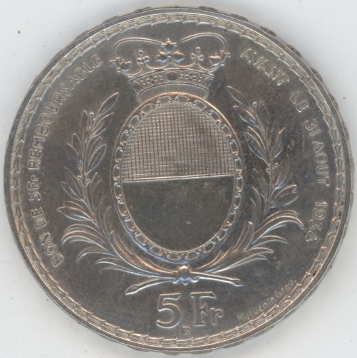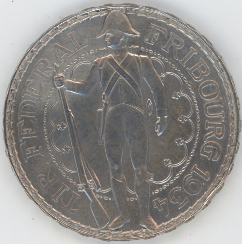Suisse / Schweiz Ecus de Tir 5 Francs 1934 Fribourg (vz) petit coup sur la tranche en argent 0.835 (15gr)