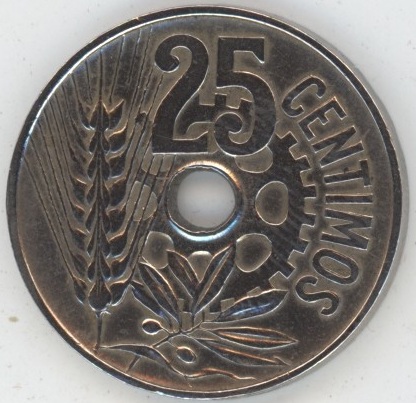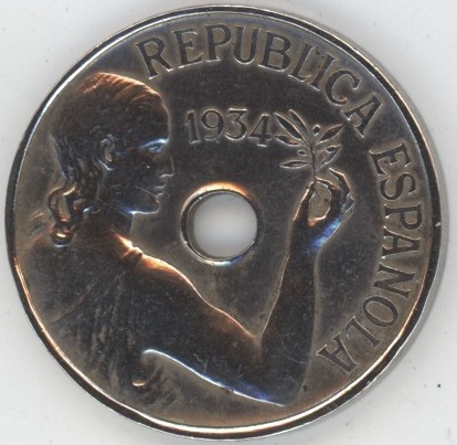 Espagne 25 Centimos 1934 (ss+) Copper-Nickel KM# 751