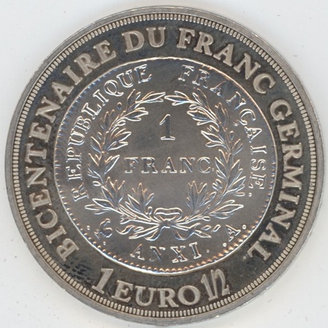 France 1½ Euro Franc Germinal (vz) en argent 0.900 (22.20gr) KM# 1351