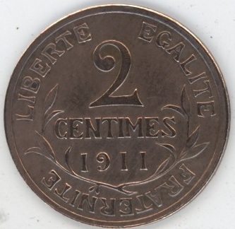 France 2 Centimes 1911 Daniel-Dupuis (ss-vz) Bronze KM# 841