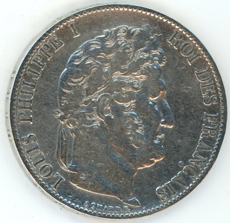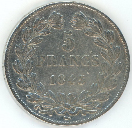 France 5 Francs 1845 W Louis Philippe I (s-ss) en argent 0.900 (24.9gr) KM# 749.13