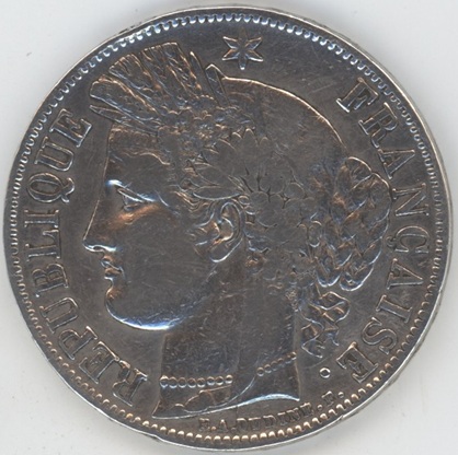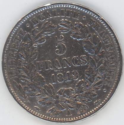 France 5 Francs 1849 A Cérès (ss) avec petits coups sur la tranche en argent 0.900 (25gr) KM# 761.1