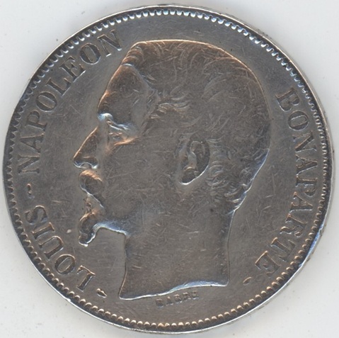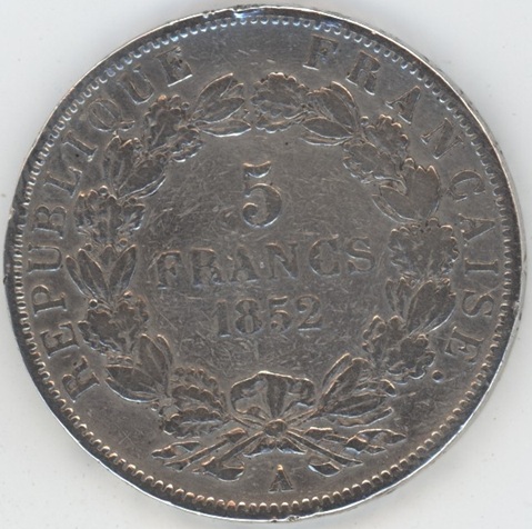 France 5 Francs 1852 A Louis-Napoléon Bonaparte tête nue (s-ss) en argent 0.900 (25gr) KM# 773.1