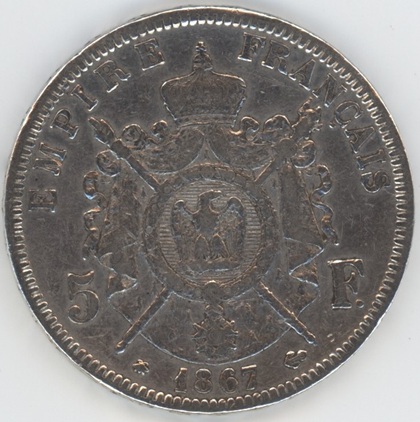 France 5 Francs 1867 A Napoléon III (ss) en argent 0.900 (25gr) KM# 799.2