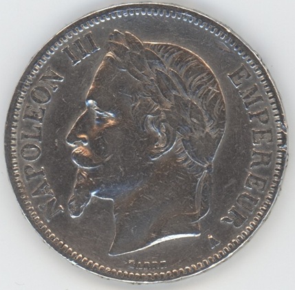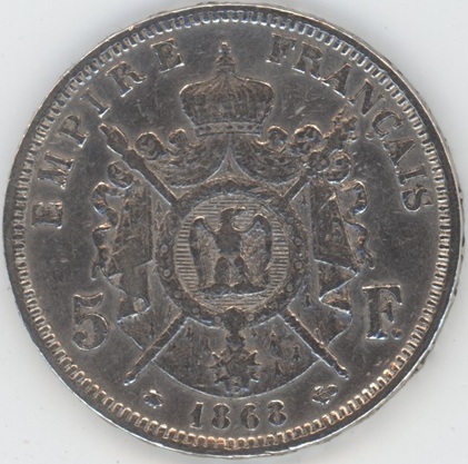 France 5 Francs 1868 A Napoléon III (ss) petits coups sur la tranche en argent 0.900 (25gr) KM# 799.1