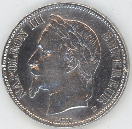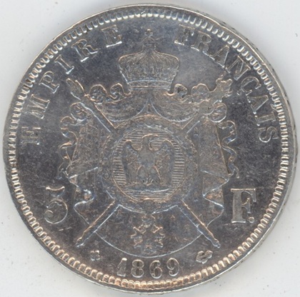 France 5 Francs 1869 BB Napoléon III (ss) en argent 0.900 (25gr) KM# 799.2
