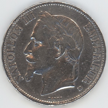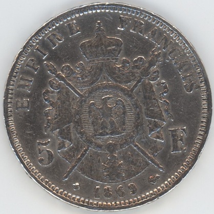 France 5 Francs 1869 BB Napoléon III (ss) en argent 0.900 (25gr) KM# 799.2