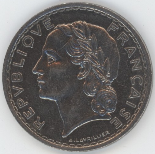 France 5 Francs 1938 Lavrillier (ss-vz) Nickel KM# 888