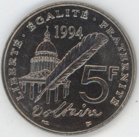 France 5 Francs 1994 Voltaire (vz) cupronickel KM# 926a.1
