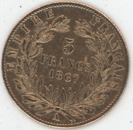 France 5 Francs OR 1867 A Napoléon III Tête laurée (ss) petites rayures en or 0.900 (1.61gr) KM# 803