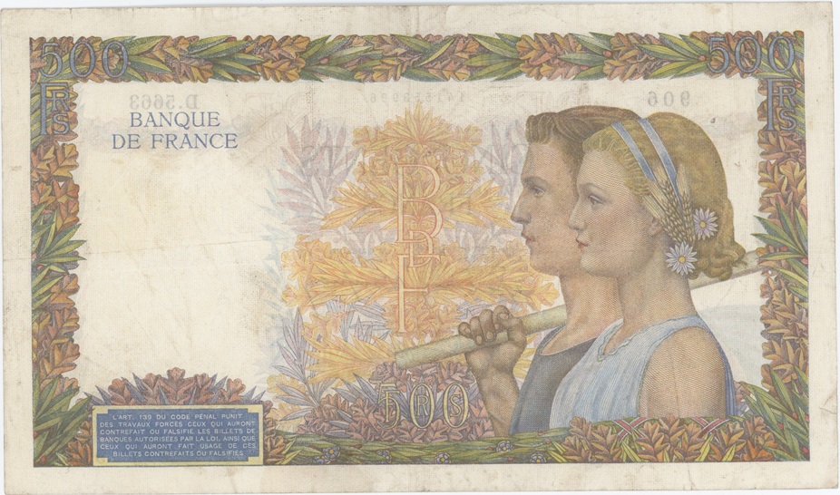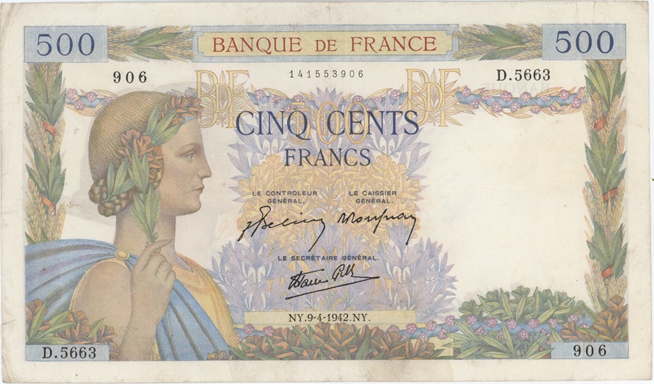France 500 Francs 1942 La Paix utilisé petite déchirure