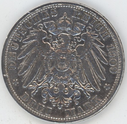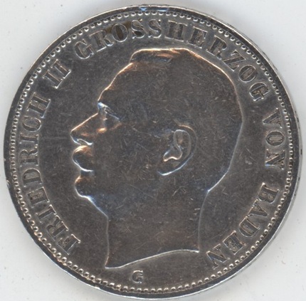 Germany Baden 3 Mark 1909 G Friedrich II (ss) en argent 0.900 (16.67gr) KM# 280