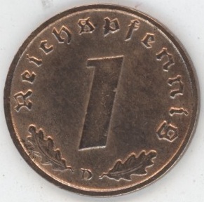 Germany Troisième Reich 1 Reichspfennig 1938 D (ss+) Bronze KM# 89