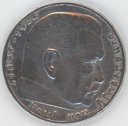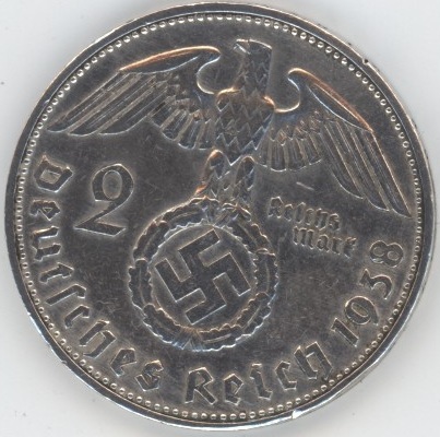 Germany Troisième Reich 2 Mark 1938 E Paul von Hindenburg (ss+) en argent 0.625 (8gr) KM# 93