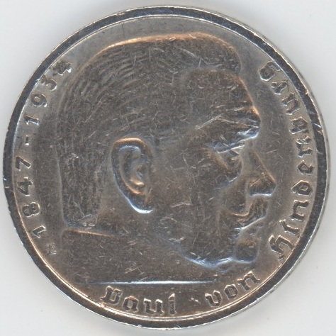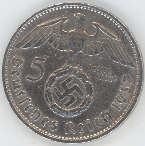 Germany Troisième Reich 5 Reichsmark 1937 E Paul von Hindenburg (ss) en argent 0.900 (13.88gr) KM# 83