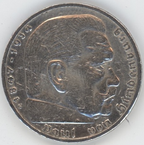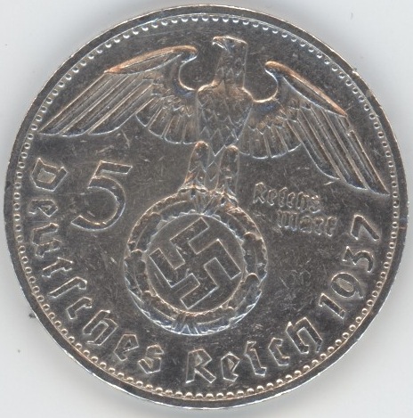 Germany Troisième Reich 5 Reichsmark 1937 G Paul von Hindenburg (ss) en argent 0.900 (13.88gr) KM# 83