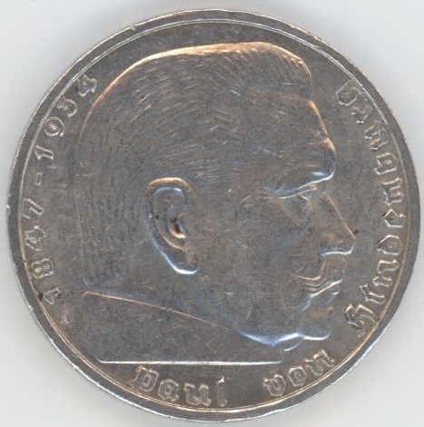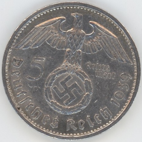 Germany Troisième Reich 5 Reichsmark 1939 A Paul von Hindenburg (ss) en argent 0.900 (13.88gr) KM# 83