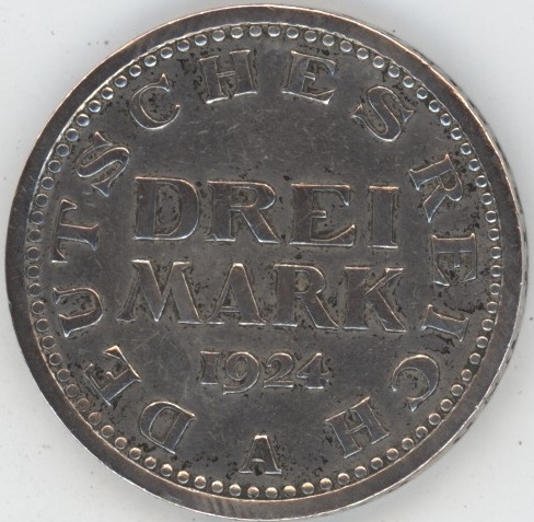 Germany Weimar 3 Reichsmark 1924 A (ss) en argent 0.500 (15gr) KM# 43