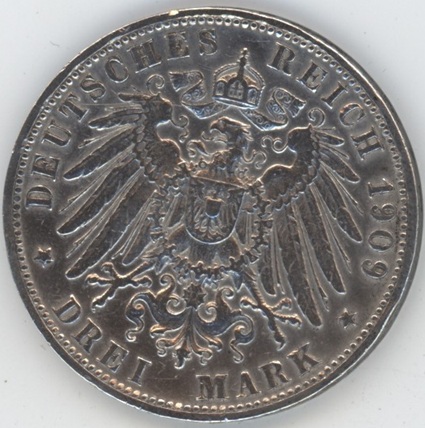 Germany Wurtemberg 3 Mark 1909 F Guillaume II (ss) coups sur la tranche en argent 0.900 (16.6gr) KM# 635
