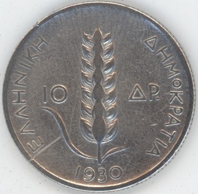 Grèce 10 Drachmai 1930 (ss) en argent 0.500 (7gr) KM# 72