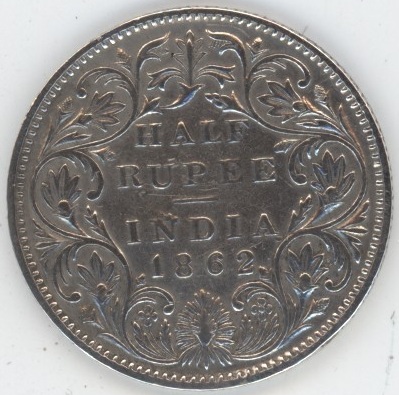 Inde Britannique 1/2 Rupee 1862 Victoria (ss) en argent 0.917 (5.83gr) KM# 472