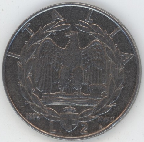 Italie 2 Lire 1939 XVIII Vittorio Emanuele III Non-magnetic (ss-vz) Stainless Steel KM# 78a