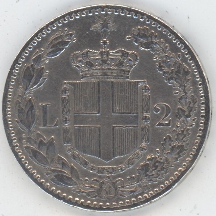 Italie 2 lires 1881 R Humbert Ier (ss+) petit coup sur la tranche en argent 0.835 (10gr) KM# 23