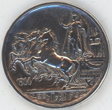 Italie 2 lires 1914 Victor-Emmanuel III (ss+) en argent 0.835 (10gr) KM# 55
