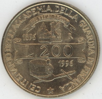Italie 200 lires 1996 100e anniversaire de l’Académie de la Guardia di Finanza (vz-unz) Bronzital KM# 184