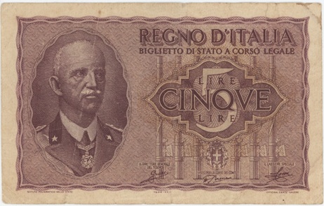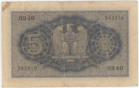 Italie 5 Lire 1944 Impero utilisé petites déchirures