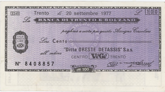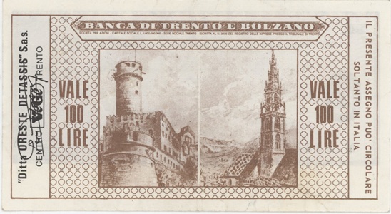 Italie Banca Di Trento E Bolzano 100 Lire 1977 billet d’urgence Italie utilisé