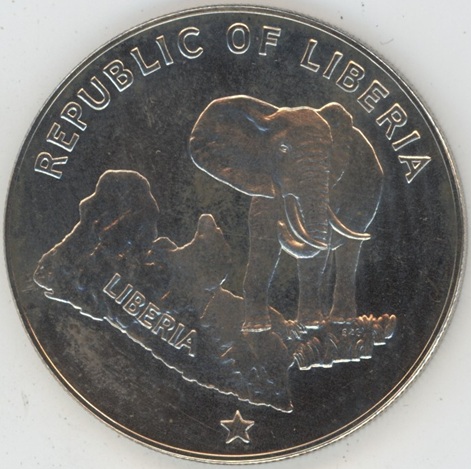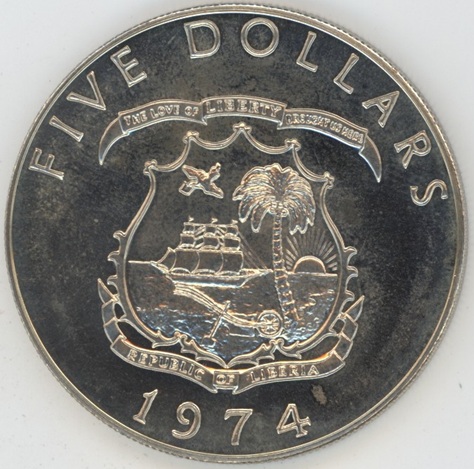 Liberia 5 Dollars 1974 (vz) en argent 0.900 (34.1gr) KM# 29