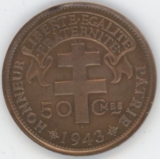 Madagascar France Libre 50 Centimes 1943 (ss-vz) Bronze KM# 1