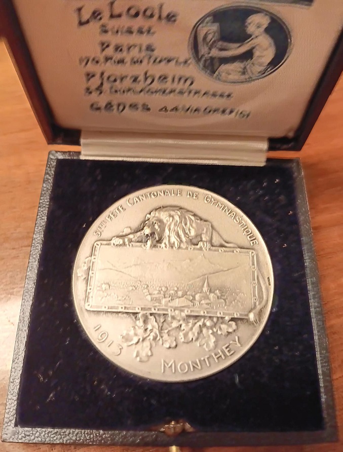 Médaille Valais Monthey 1913 Fête Cantonale de Gymnastique (fast unz) Bronze argenté (56.5gr) Huguenin Frères