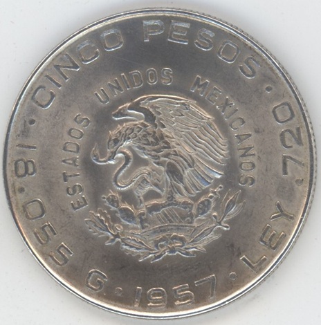 Mexico 5 Pesos 1957 Miguel Hidalgo (ss+) en argent 0.720 (18.05gr) KM# 469